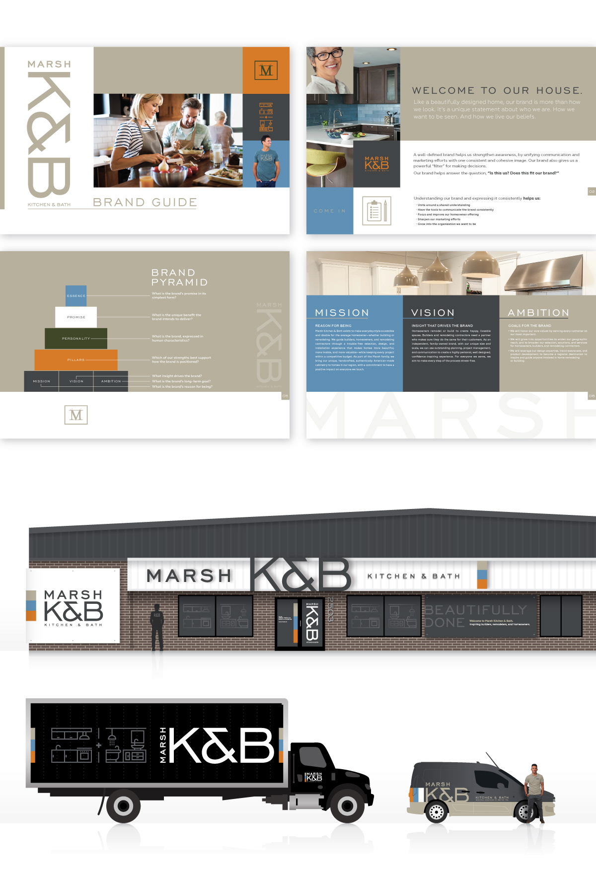 Above: Marsh K&B brand guidelines document sample spreads. Exterior showroom branding design and company vehicle livery graphic design.