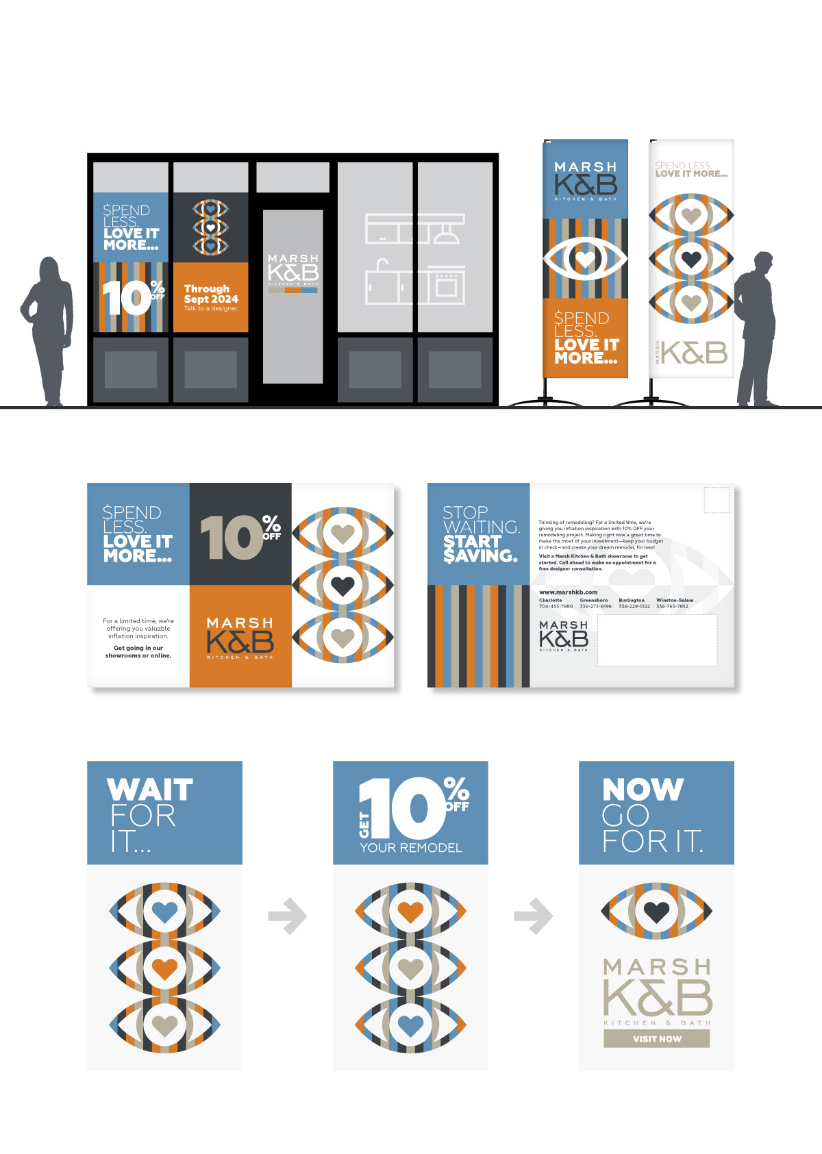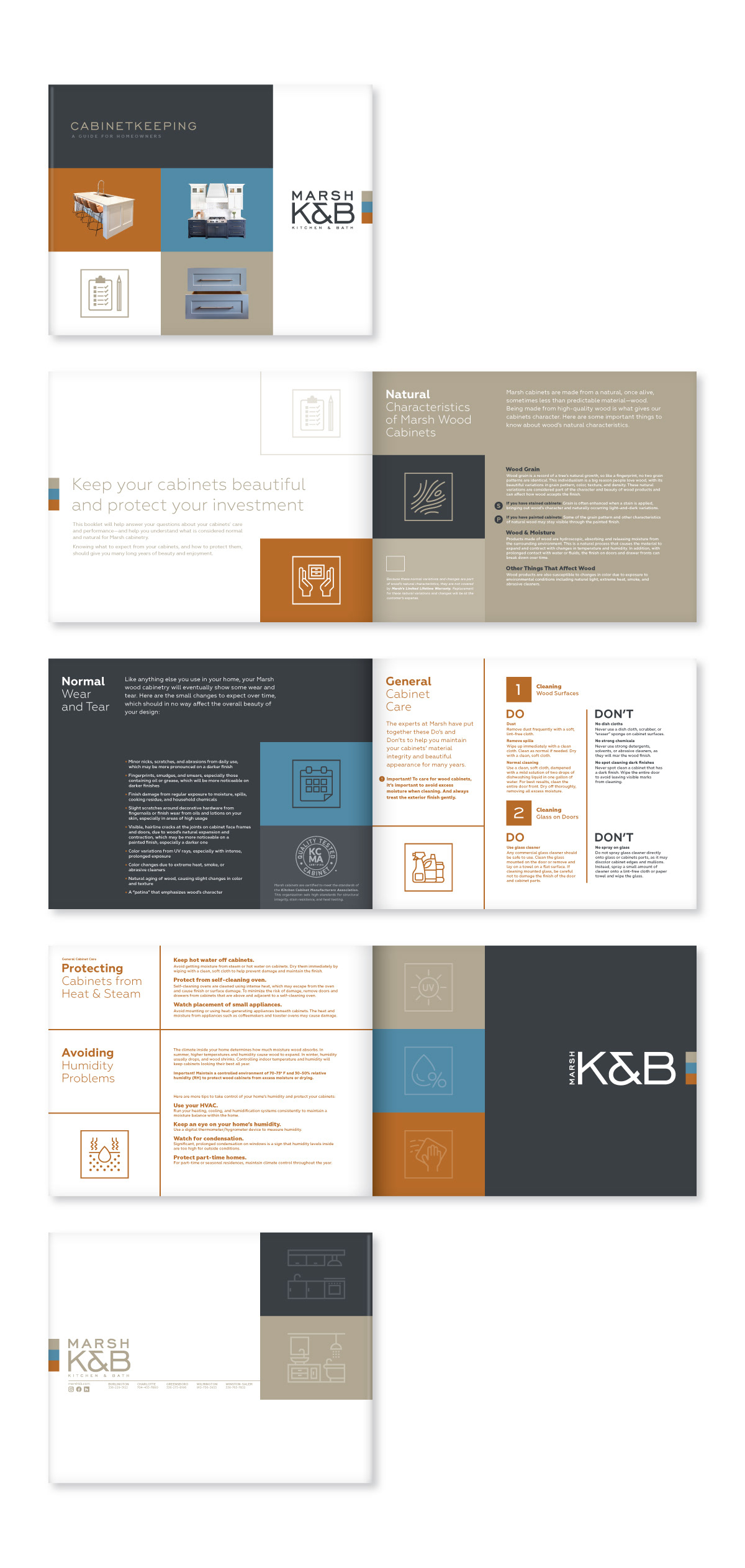 Above: Marsh K&B cabinet owners guide (care, cleaning and general information). Below: Marsh K&B promotional branding event (store graphics, direct mail branding and online promotions).