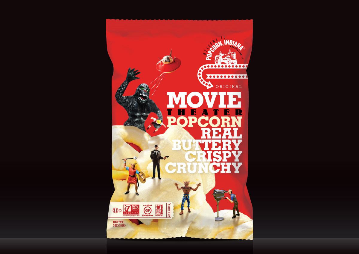Design Objective: Design a quirky, movie-themed line of popcorn packaging.